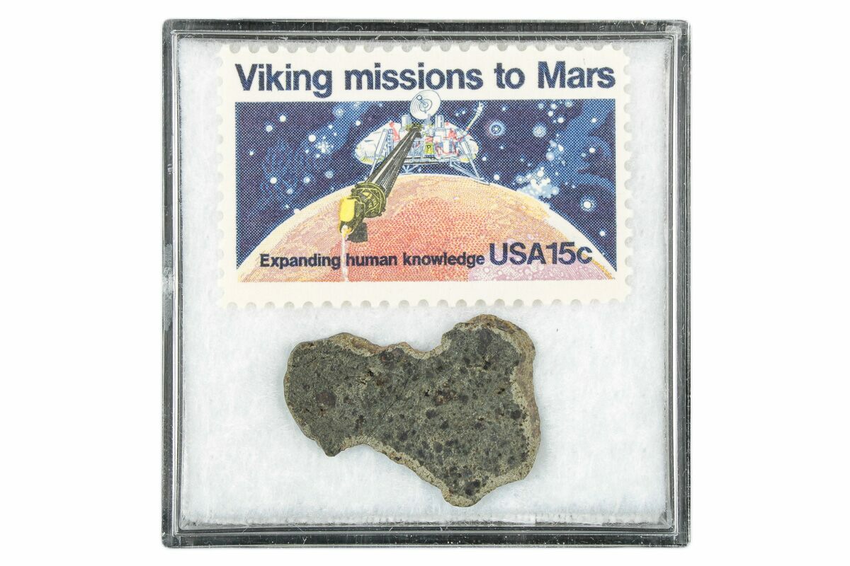 This is a .98" wide (1.51 grams) martian meteorite slice from the Amgala 001 fall. This meteorite comes in a custom acrylic case which includes a 1978 Viking Mission to Mars stamp. This 15-cent multicolored commemorative stamp depicts the Viking 1 lander, the landing component, collecting a soil sample on Mars.