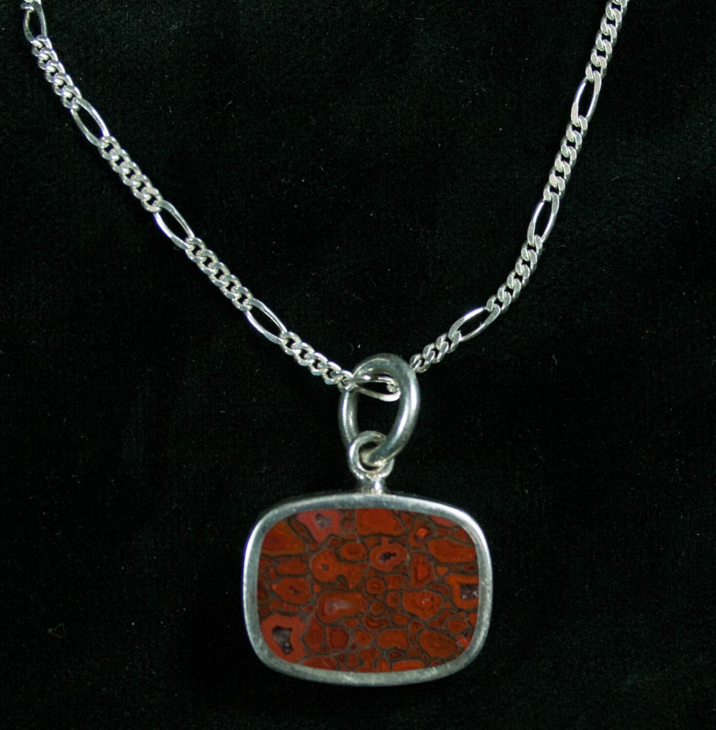 This is a sterling silver reversible pendant inlaid with gem quality, 150 million year old dinosaur bone on one side and Gibeon Meteorite on the reverse side. The dinosaur bone is a bright red/orange color and has large cells, meaning it came from a theropod (meat eating) dinosaur from the Morison Formation.