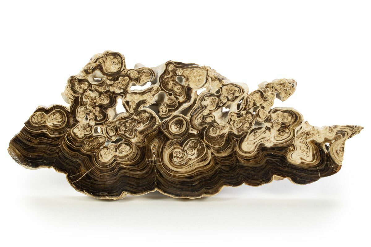 Hailing from the rugged landscapes of Balochistan in Pakistan, chocolate calcite is a geological treasure born of earth’s artistic forces. Over millions of years, calcium carbonate-rich solutions seeped through limestone caves and ancient seabeds, depositing calcite in rhythmic layers. The presence of iron oxide and other minerals during this process imparted the stone’s distinctive chocolate-brown hue, while purer calcite layers remained pearly white or honeyed beige. The result is the banded chocolate-and-cream marvel we see today.