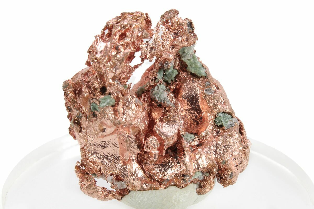 Native copper occurs rarely as isometric cubic and octahedral crystals, but more typically as irregular masses and fracture fillings. It has a reddish, orangish, and/or brownish color on fresh surfaces, but typically is weathered and coated with a green tarnish of copper carbonate.