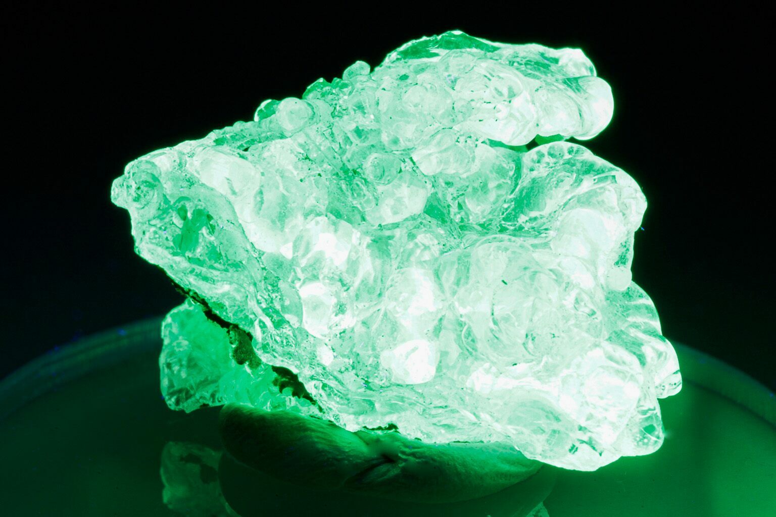 One of hyalite’s most distinctive features is its intense fluorescence: under shortwave ultraviolet light, many specimens glow a vivid neon green. This striking effect is caused by trace amounts of uranium, present as uranyl ions, incorporated into the opal’s structure during formation. In normal lighting, hyalite often appears colorless and glass-like, making its dramatic UV response especially surprising and highly prized by mineral collectors.