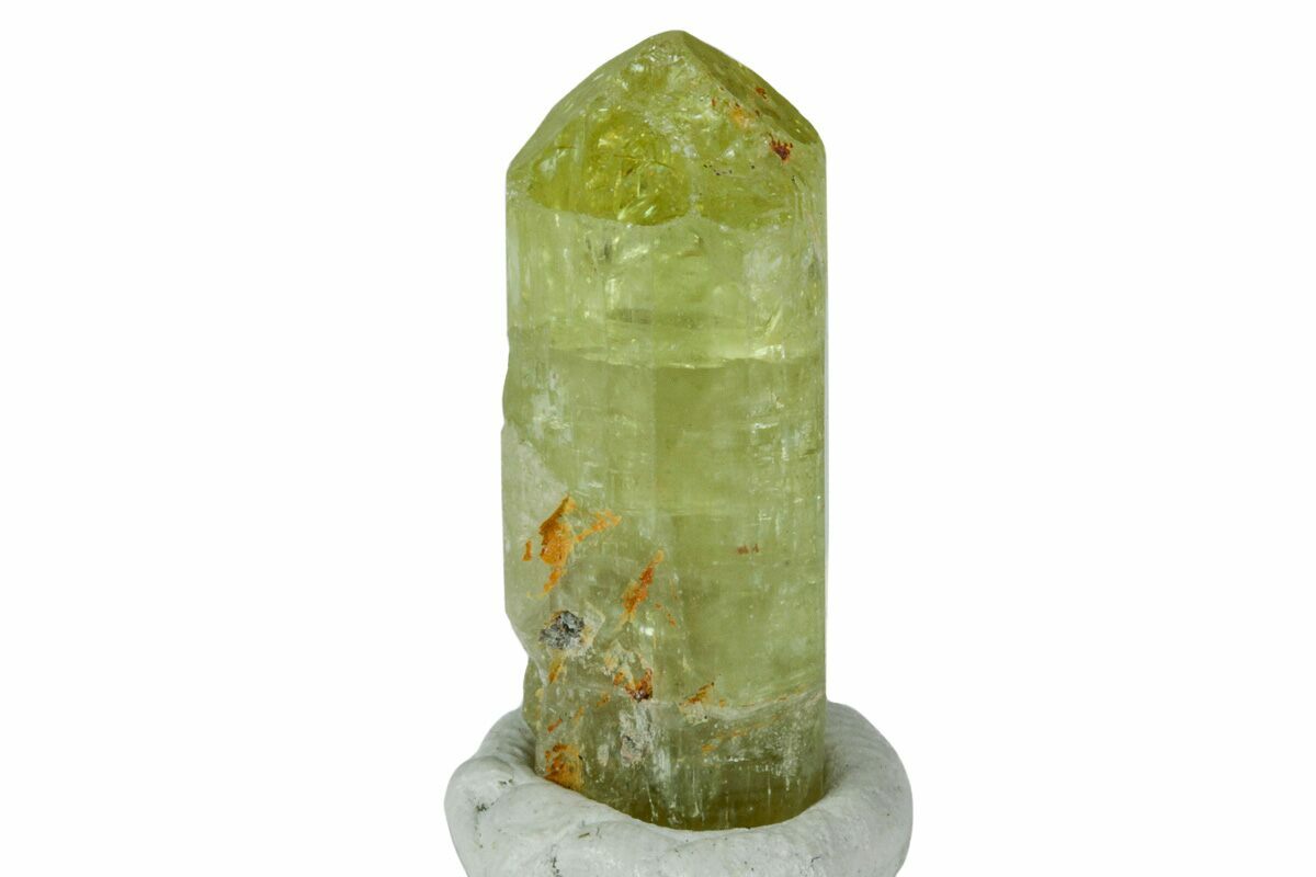 This is a lustrous greenish-yellow apatite crystal with a nice termination from Imilchil, Morocco. It has been mounted to a display base with mineral tack.