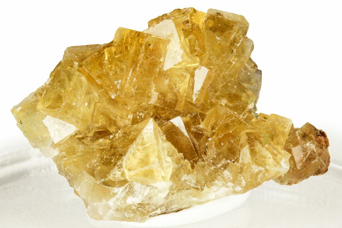 This is an alluring, 1.05" wide, lustrous yellow fluorite crystal cluster, collected from the Moscona Mine in Asturias, Spain. The crystals are translucent and exhibit a beautiful yellow color. Under shortwave UV, these fluorite crystals fluoresce a faint purple color.