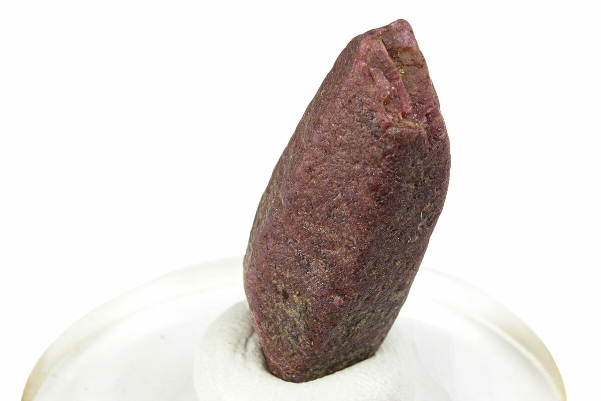 This is a beautiful, 1.05" wide "floater" crystal of ruby from the Mysore District of Kamataka, India. These rubies form naturally within a hard matrix from which they have been completely removed. It bears a deep magenta coloration and is opaque. Under shortwave UV light, the crystal exhibits a vibrant red-pink fluorescence.