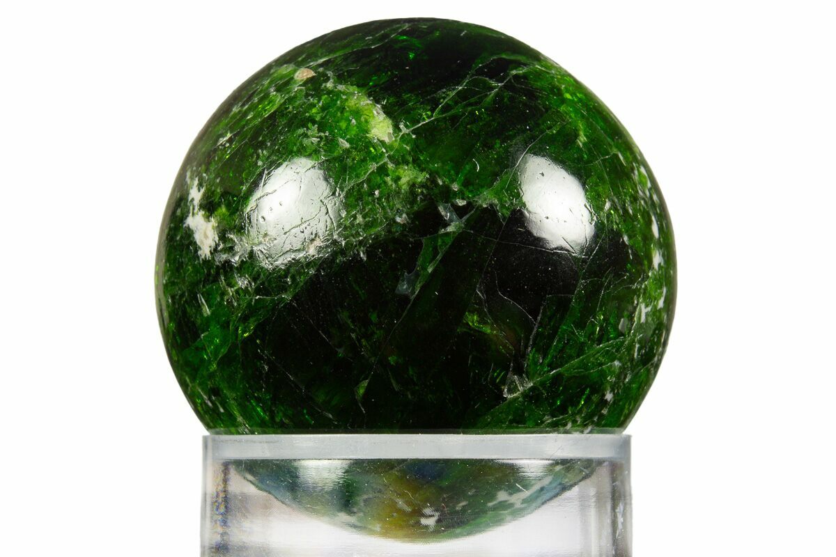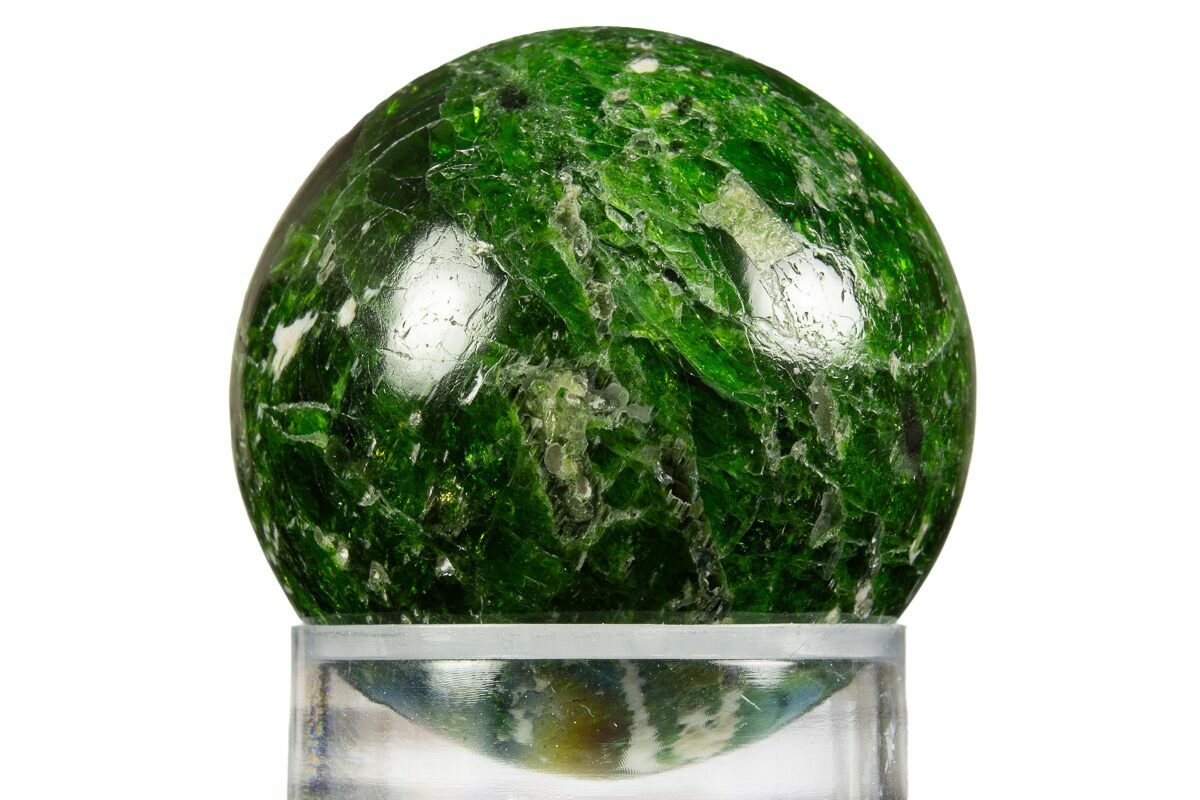 This is a 1.5" wide specimen of vibrant green chrome diopside collected from the mountains of Yakutia, Russia. It has been shaped into a sphere and flawlessly polished to a glossy finish.