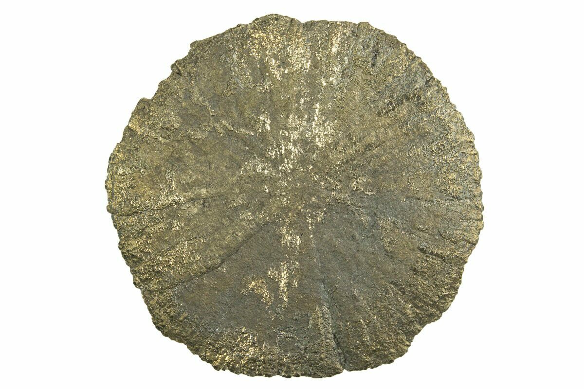 Pyrite suns or pyrite dollars are an unusual pyrite formation: striations radiate out from the center like rays of the sun. They are found in narrow, compacted seams of slate interbedded in the 300 million-year-old coal deposits near Sparta, Illinois. They are recovered as a byproduct of local coal mining operations, but are increasingly difficult to source as the coal mines in Illinois shut down one by one.