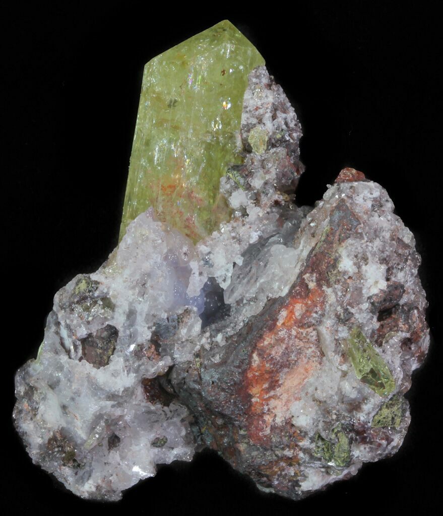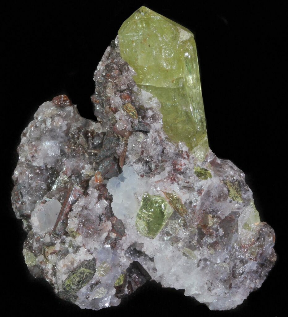 This is a lustrous, lemon yellow, apatite crystal still in matrix from Cerro del Mercado (Iron Mountain) at Durango, Mexico. One beautiful, transparent crystal can be found exposed on what could be considered the top of the specimen. The metallic mineralization on this specimen is magnetite, with the quartz acting as a glue, holding all of the minerals together.