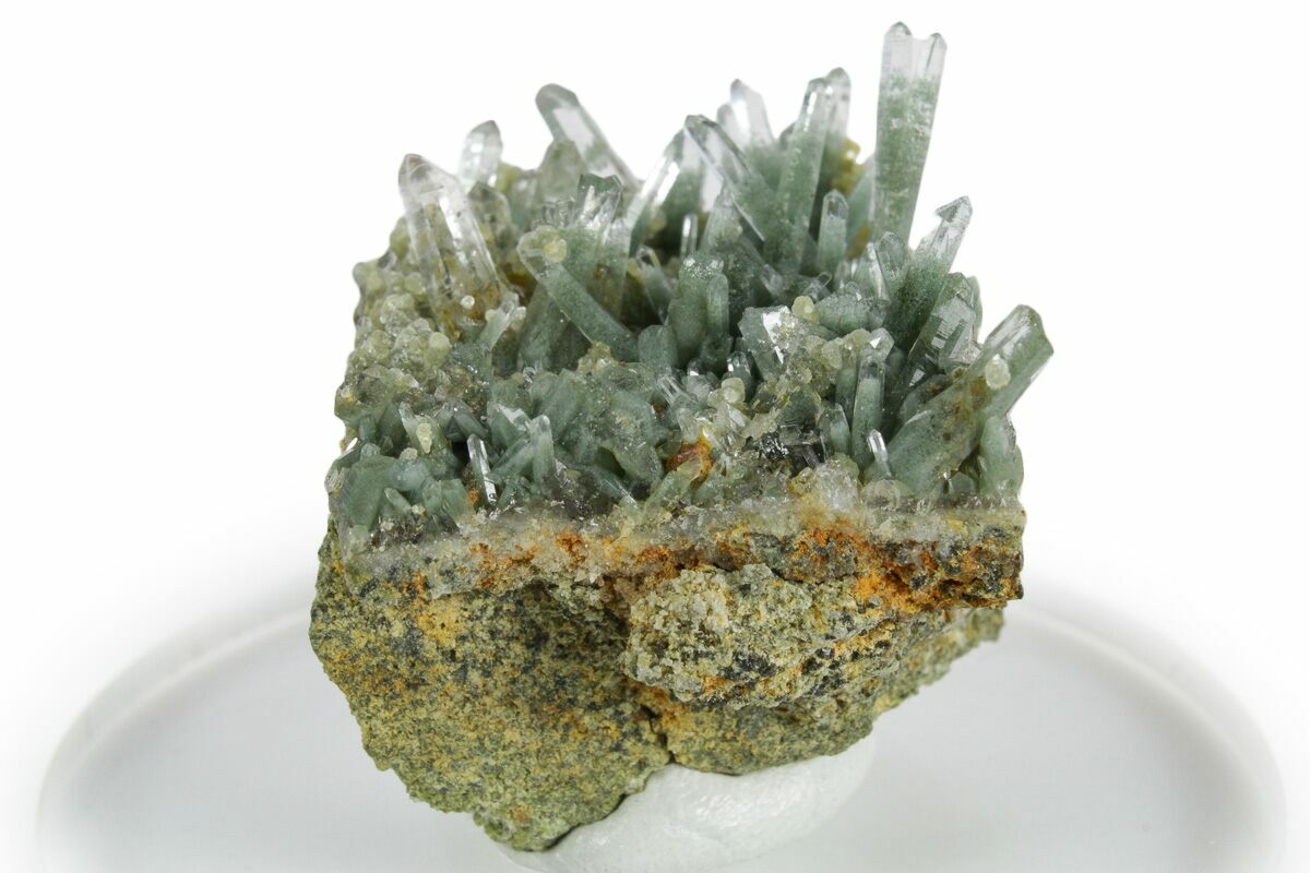 This is a 1.1" wide cluster of glassy quartz crystals with what appears to be mica aggregations, collected in Peru. I suspect this is a new find as there is very little information on the specific deposit it came out of. The green color of the quartz can be attributed to chlorite inclusions. This specimen has been mounted with mineral tack for museum-quality display.