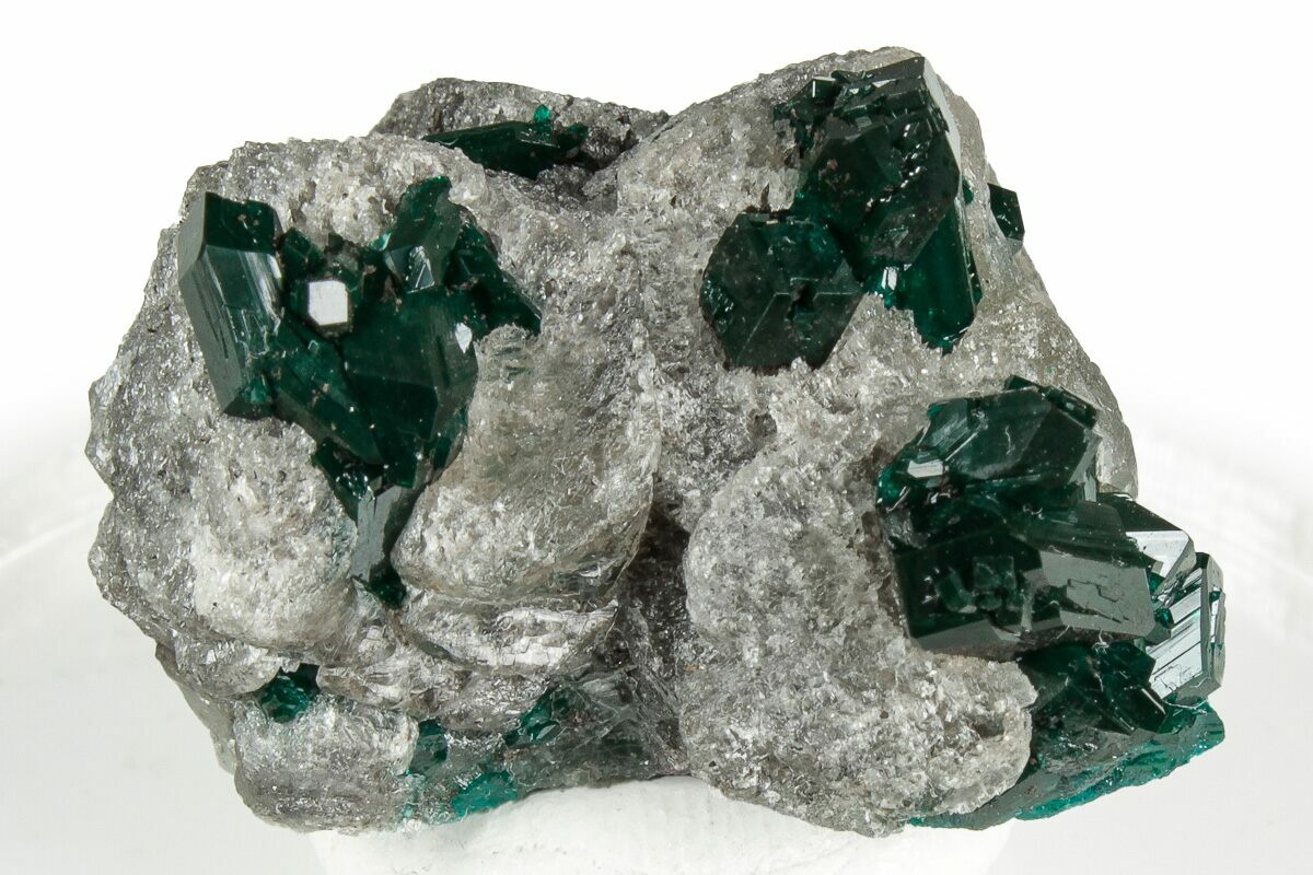 This is a cluster of dioptase crystals that's almost entirely encrusted in calcite, collected from the Mindouli District in Brazzaville (Republic of Congo). The crystals exhibit a brilliant luster and bear the alluring emerald-green coloration unique to dioptase.