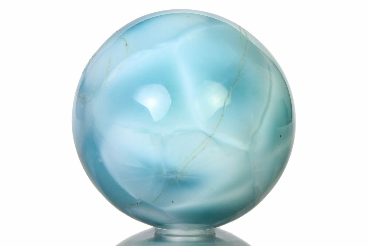 This is a stunning, 1.1" wide, hand polished sphere made of rare larimar collected from the Los Chupaderos mine in the Dominican Republic. This piece is of top quality with great color and flowery patterning.