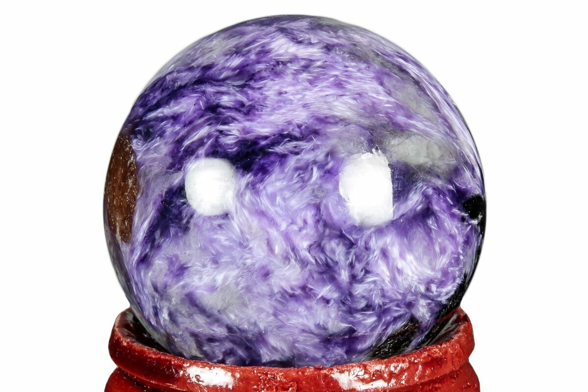 This is a beautiful polished charoite sphere from Siberia, Russia. It measures 1.1" in diameter and has been polished to a glossy finish. Comes with the pictured display stand.