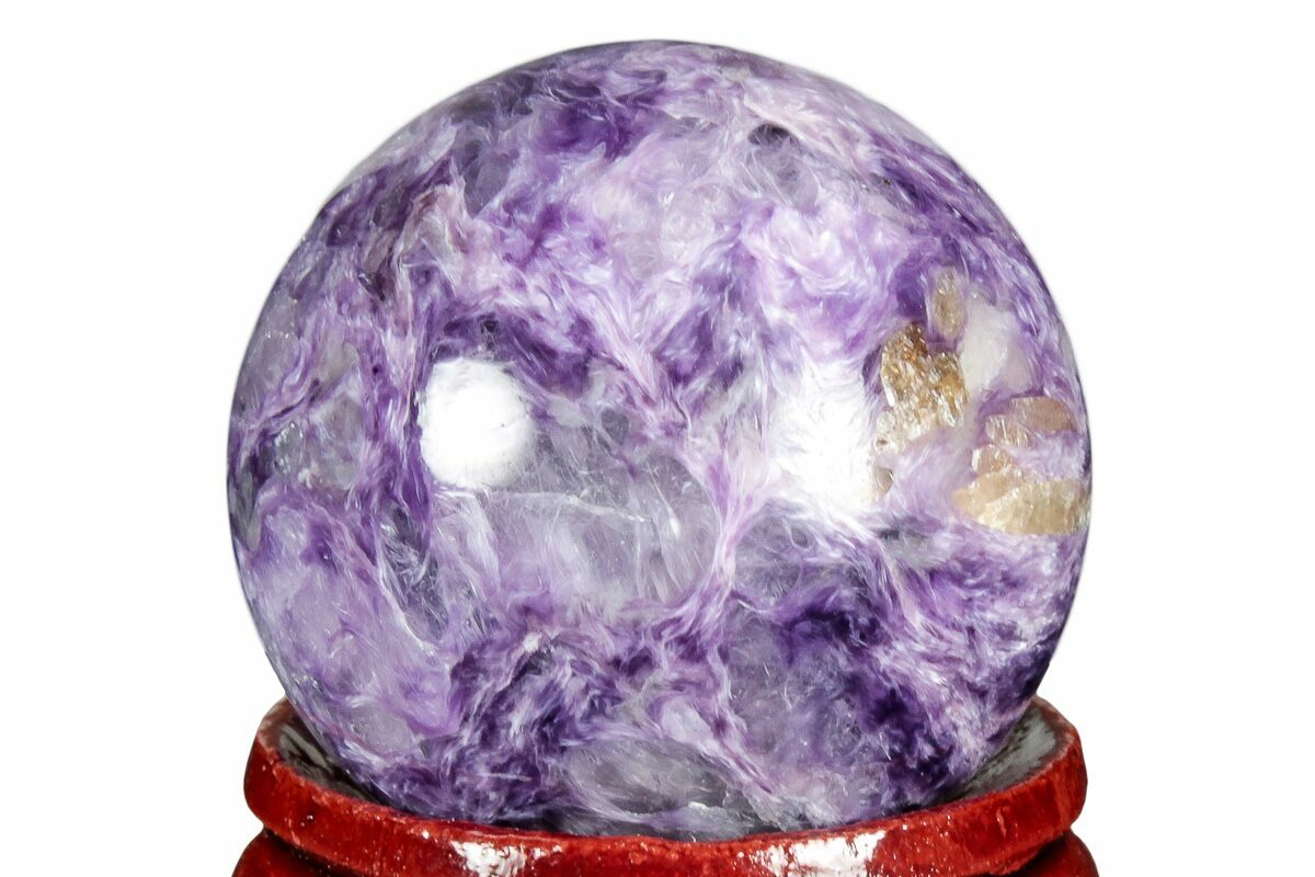 This is a beautiful polished charoite sphere from Siberia, Russia. It measures 1.1" in diameter and has been polished to a glossy finish. Comes with the pictured display stand.