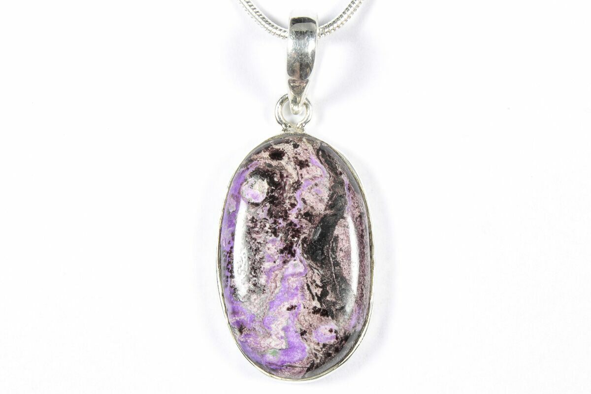 This is an eye-catching sugilite pendant featuring a polished sugilite stone set in 925 sterling silver. The pendant itself is 1.1" tall (including loop). A 24" silver plated snake chain with a lobster clasp is included with the pendant. You will receive the exact pendant pictured.