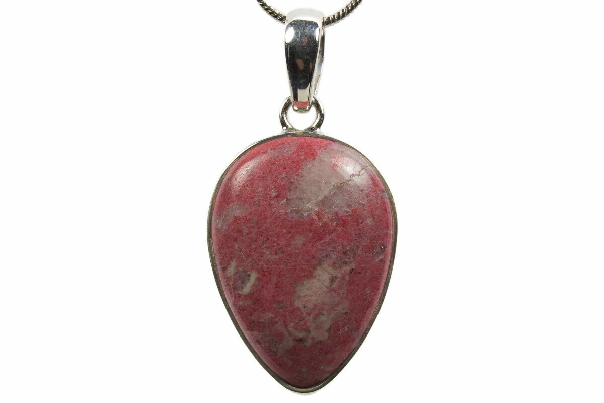 This is a 1.1" tall (inlcuding loop) pink thulite pendant, the stone of which was collected in Trondheim, Norway. The stone has stunning coloration. It is accompanied by a 24", silver-plated snake chain necklace.