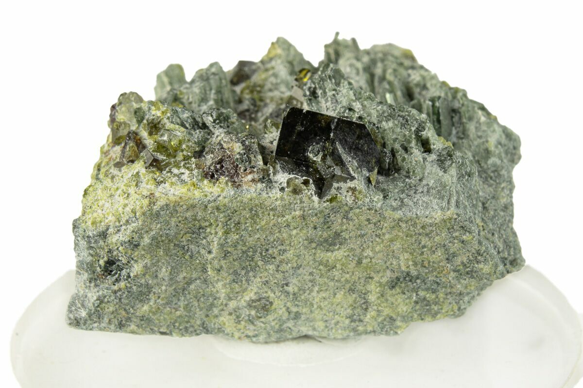 This is a gorgeous, 1.15" wide association of andradite garnet crystals with several well-formed, deep green epidote crystals and yellow-green diopside in a soft matrix. This specimen has been mounted with mineral tack for museum-quality display.