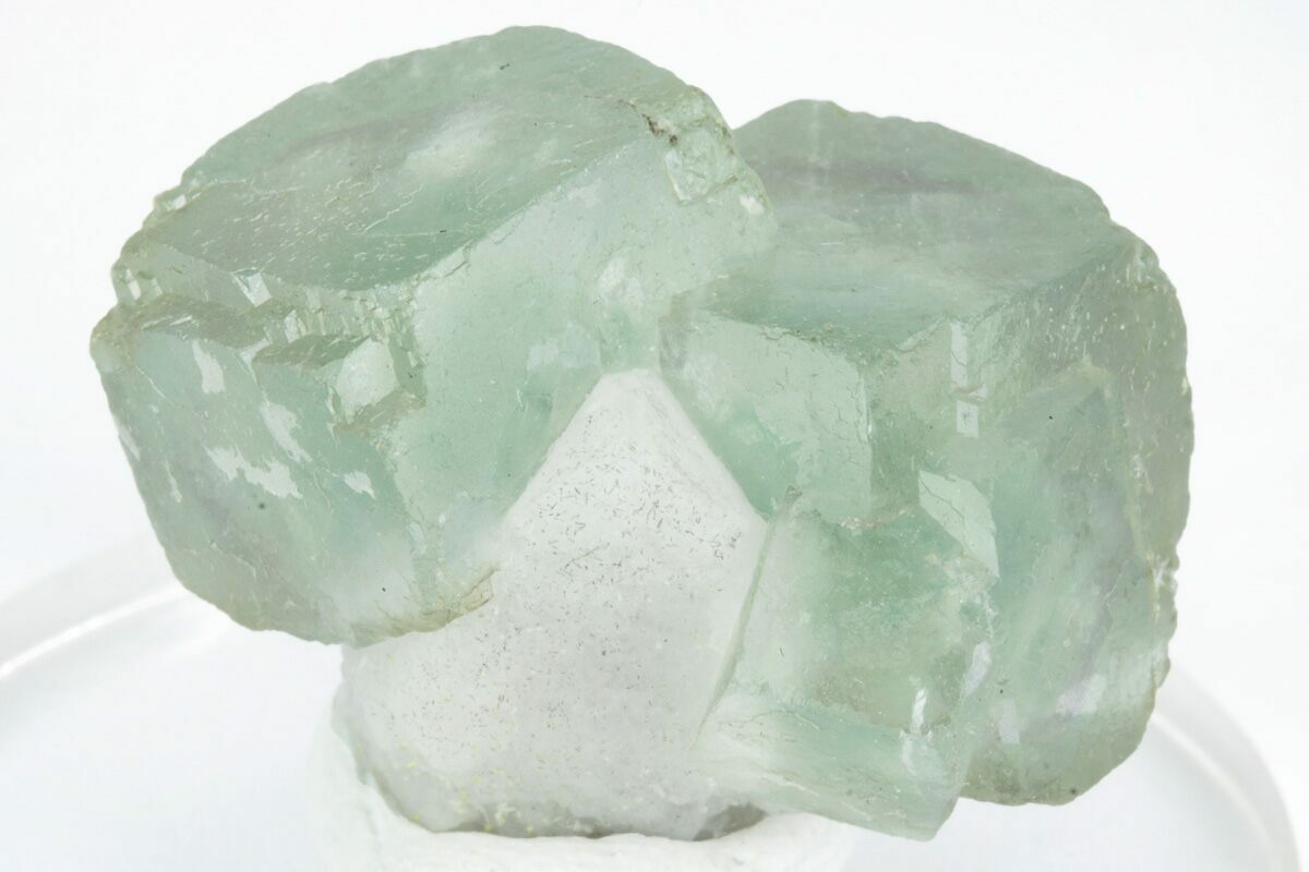 This is a beautiful association of cubic green fluorite and quartz collected from the Huanggang Fe-Sn deposits of Inner Mongolia, China. The fluorite formed over a milky-white quartz crystal with secondary growths below the termination. Under short-wave ultraviolet light, the fluorite exhibits a purple fluorescence.