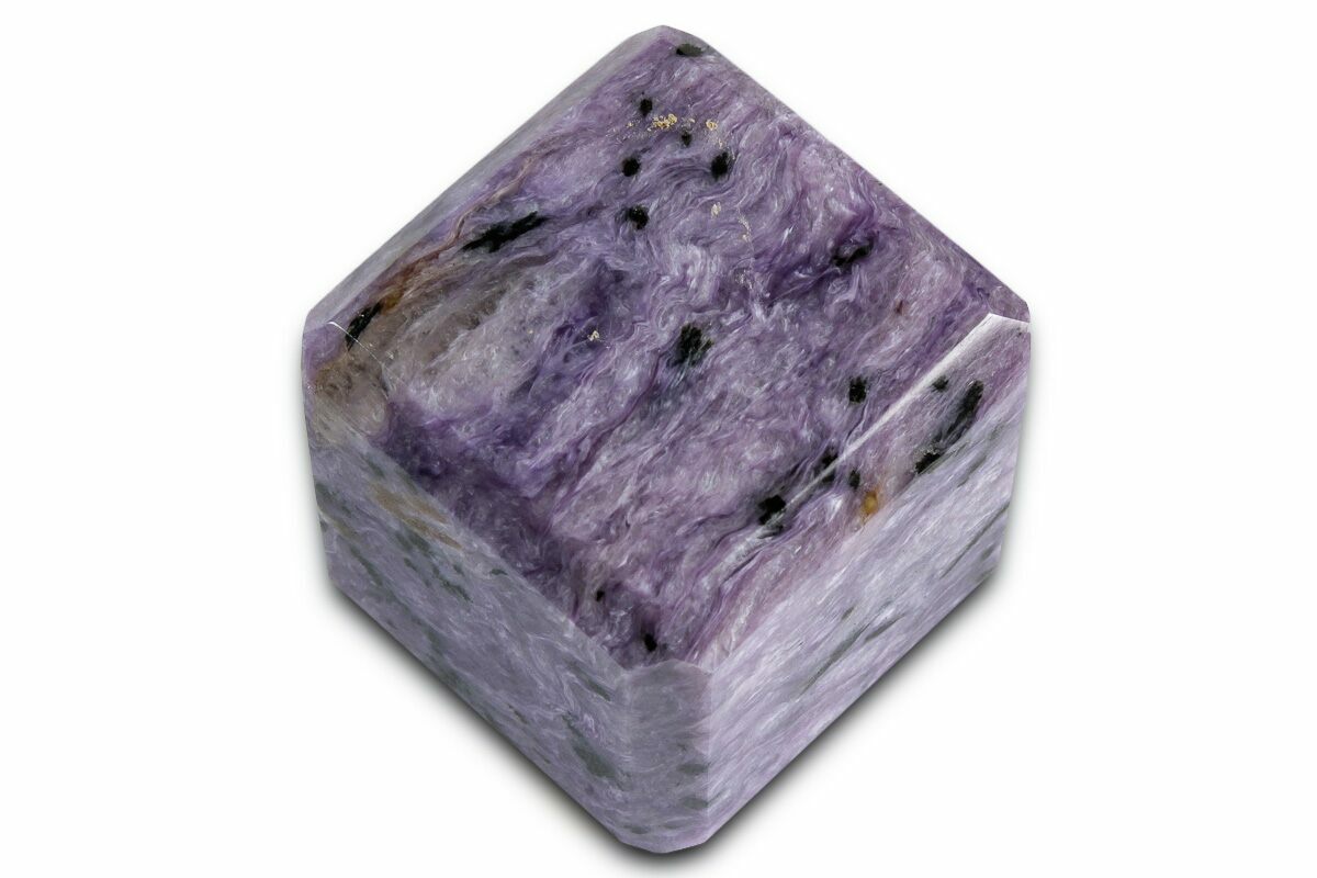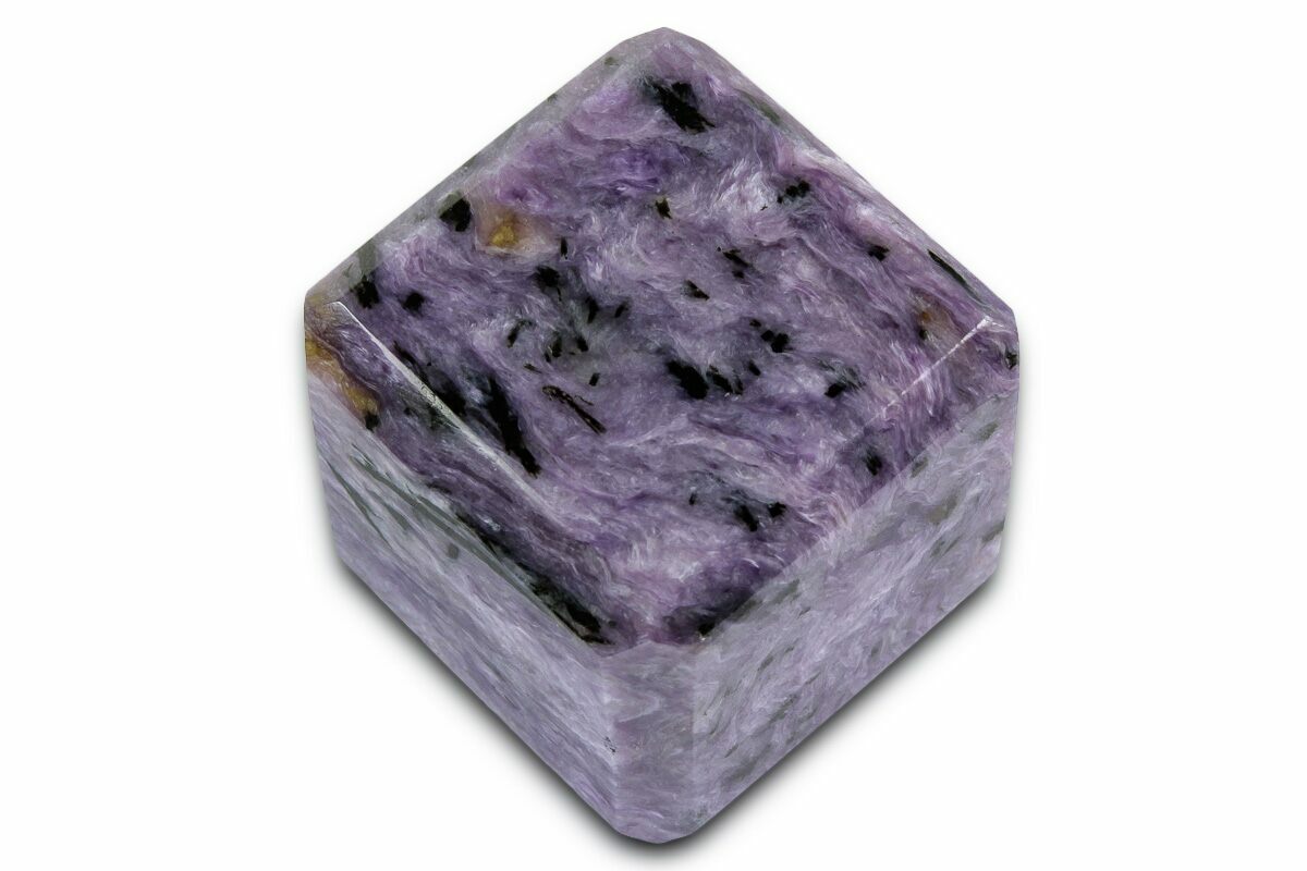 This is a beautiful, 1.15" wide purple cube that was sculpted from charoite that's mined in Siberia, Russia. It has been cut into the shape of a cube. Each face and edge has been cut flat and polished to a glossy finish.