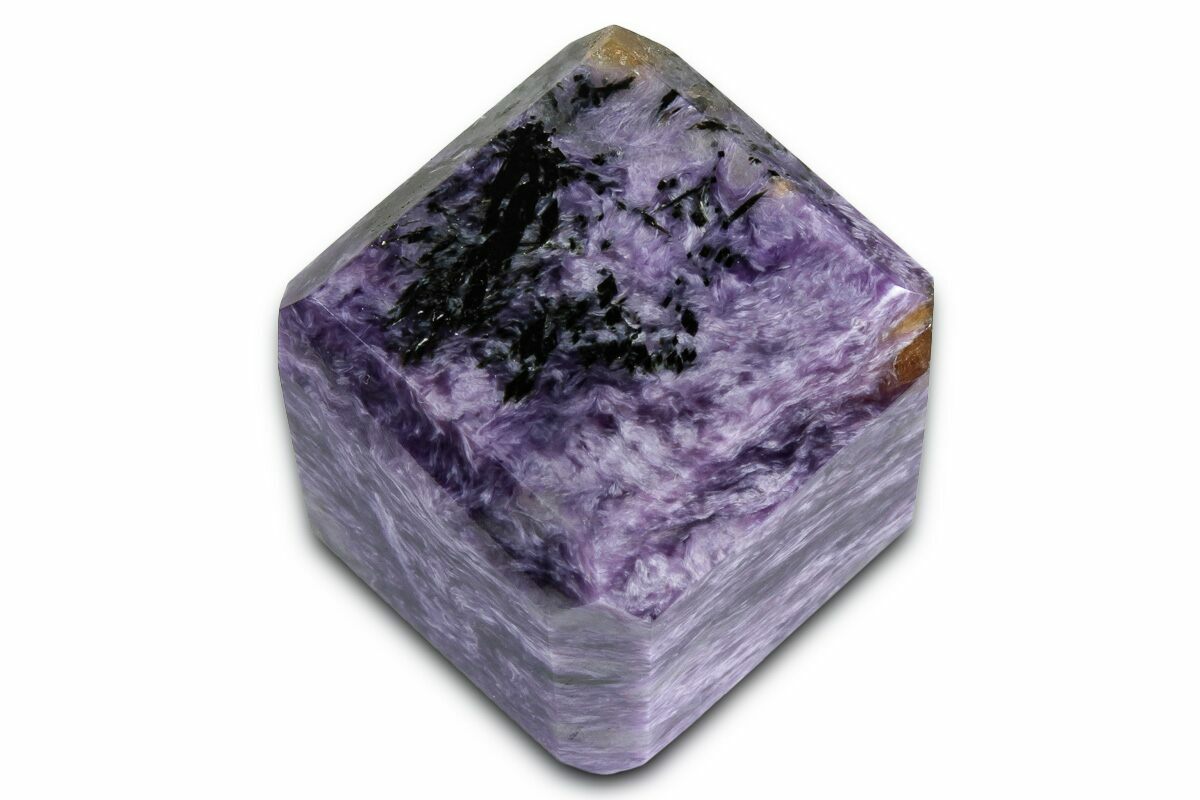 This is a beautiful, 1.15" wide purple cube that was sculpted from charoite that's mined in Siberia, Russia. It has been cut into the shape of a cube. Each face and edge has been cut flat and polished to a glossy finish.