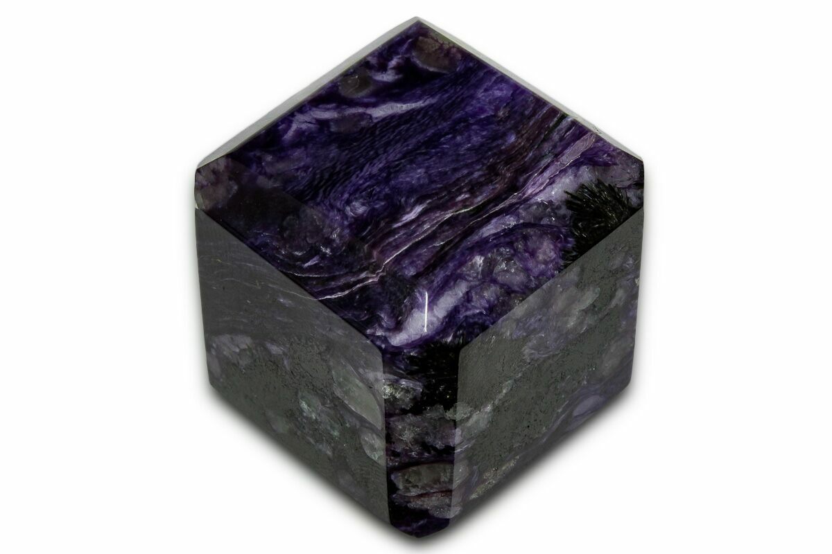 This is a beautiful, 1.15" wide purple cube that was sculpted from charoite that's mined in Siberia, Russia. It has been cut into the shape of a cube. Each face and edge has been cut flat and polished to a glossy finish.