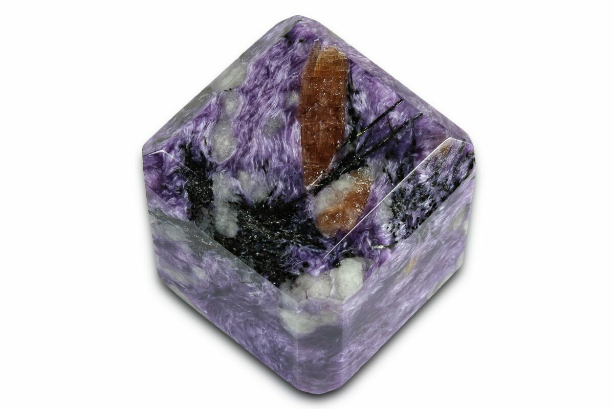 This is a beautiful, 1.15" wide purple cube that was sculpted from charoite that's mined in Siberia, Russia. It has been cut into the shape of a cube. Each face and edge has been cut flat and polished to a glossy finish.