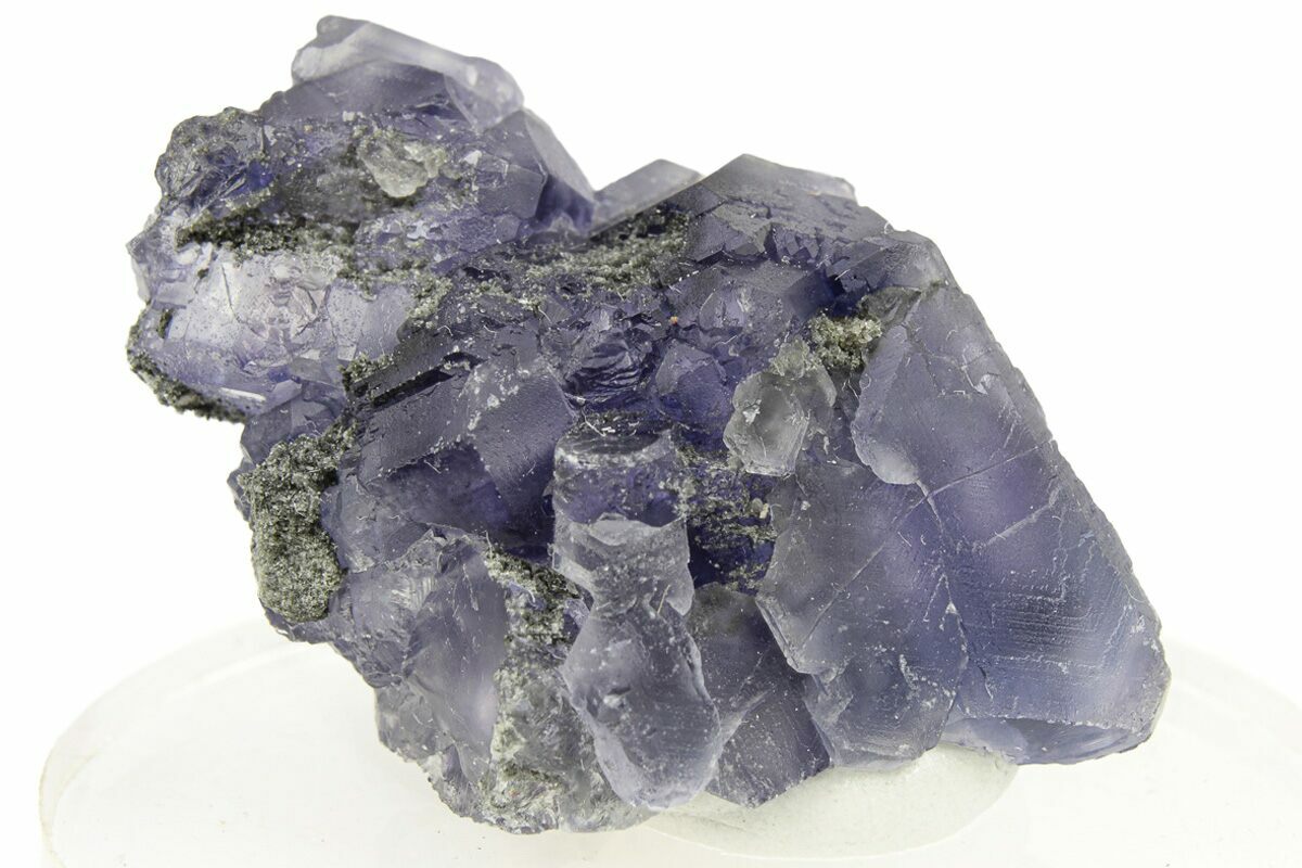 Xia Yang Mine is a mine in central China's Fujian province that produces rich, dark fluorite specimens along with calcite and quartz. The flourite from this locality tends to be blocky in shape with large faces, and can come in a range of colors from vibrant blues to deeper purples and glassy green shades. The deep purple specimens are sometimes called "Tanzanite Fluorites" for the rich, deep blue-purple coloration and the way those colors shift depending on the lighting.