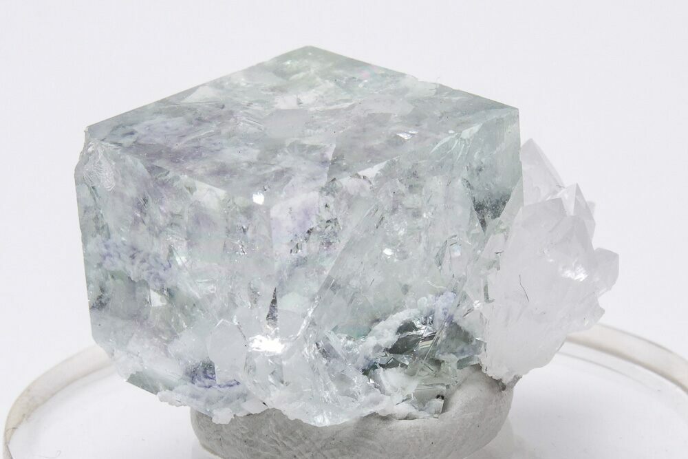 This is a beautiful green cubic fluorite crystal with splotches of purple within, that formed in association with quartz crystals. It comes out of the Hunan Province of China, a region known for its stunning fluorite formations.