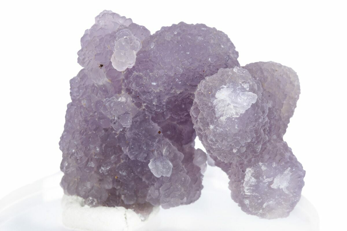 This is a high-quality, sparkling, purple grape agate specimen from Sulawesi, Indonesia. It shows purple chalcedony formations and a botryoidal structure from which it earned its name. The specimen has been mounted to an acrylic display base with mineral tack for museum-quality display.