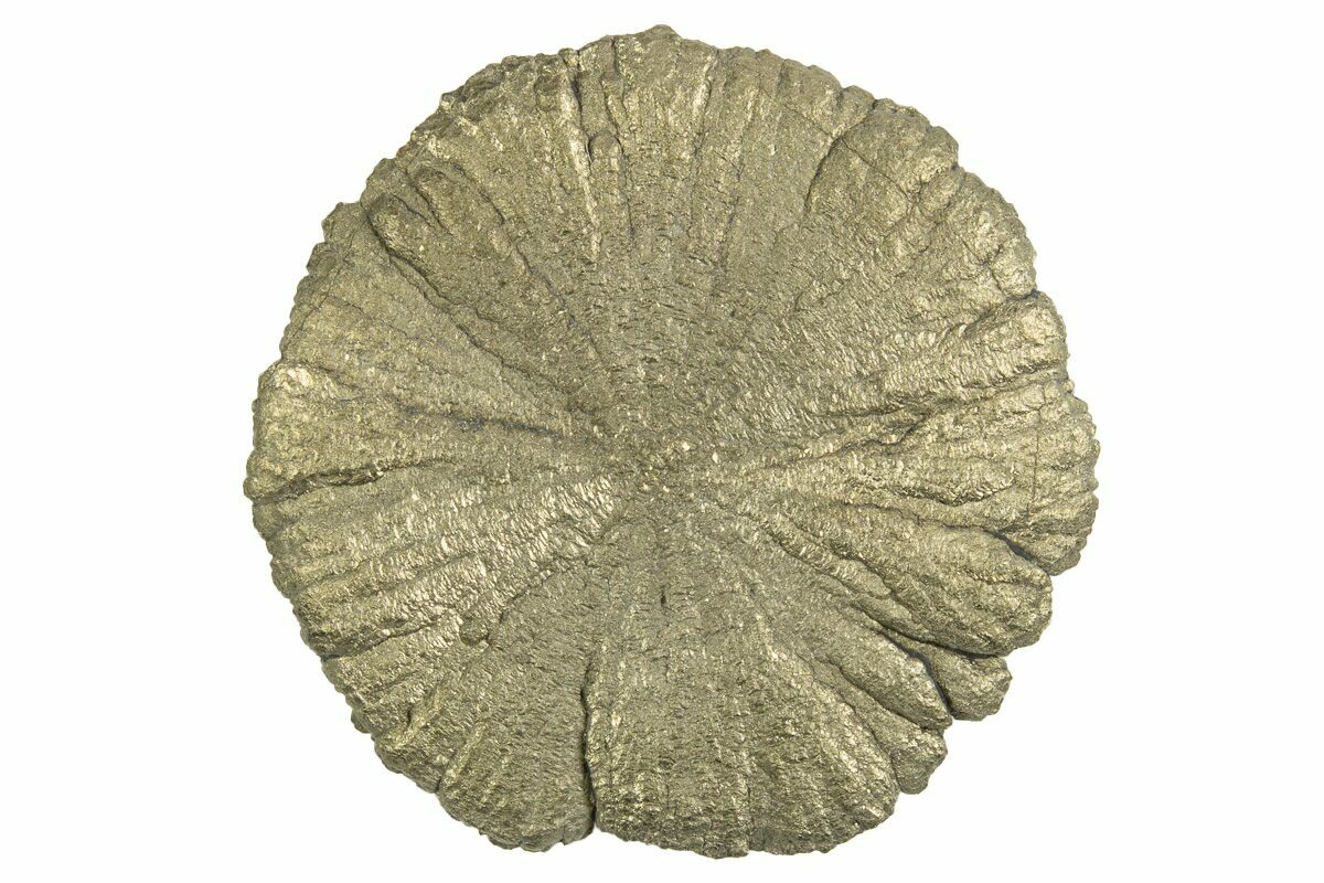 Pyrite suns or pyrite dollars are an unusual pyrite formation: striations radiate out from the center like rays of the sun. They are found in narrow, compacted seams of slate interbedded in the 300 million-year-old coal deposits near Sparta, Illinois. They are recovered as a byproduct of local coal mining operations, but are increasingly difficult to source as the coal mines in Illinois shut down one by one.