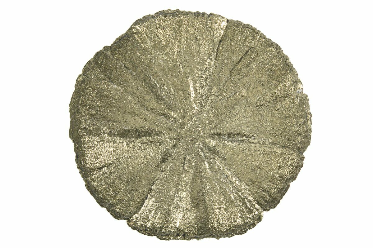 Pyrite suns or pyrite dollars are an unusual pyrite formation: striations radiate out from the center like rays of the sun. They are found in narrow, compacted seams of slate interbedded in the 300 million-year-old coal deposits near Sparta, Illinois. They are recovered as a byproduct of local coal mining operations, but are increasingly difficult to source as the coal mines in Illinois shut down one by one.