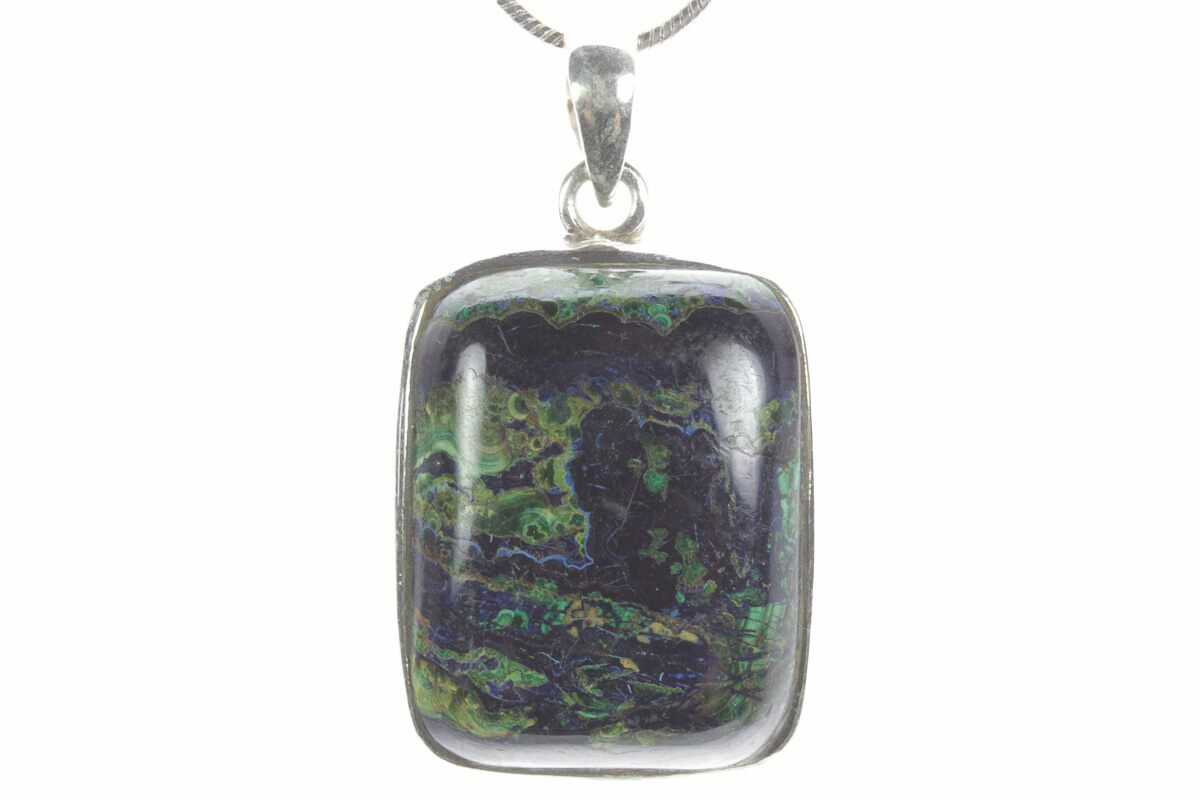This is a beautiful malachite and azurite pendant set in 925 sterling silver. The pendant itself is 1.15" tall. A 24" silver plated chain with a lobster clasp is included with the pendant. You will receive the exact pendant pictured.
