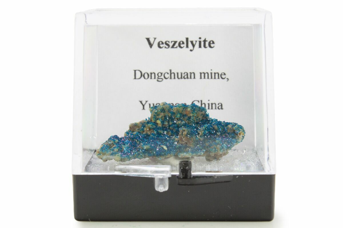 This is a beautiful, 1.15" wide cluster of vibrant blue veszelyite crystals, collected from the Dongchuan Cu Mine in the Yunnan, China.