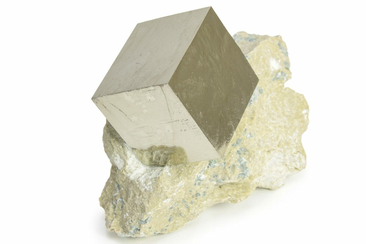 This is a 1.17" wide, natural cube of pyrite still partially embedded in the rock. It comes from the famous Victoria Mine near Navajun, Spain and has a wonderful, golden metallic luster.