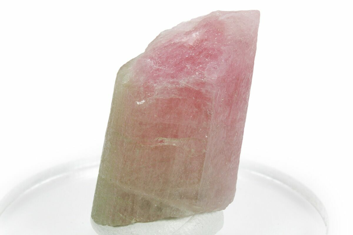 It forms in pegmatites, which are coarse-grained igneous rocks created during the final stages of magma cooling. These environments are rich in elements like boron, lithium, and water that are essential for tourmaline growth. As the crystal develops, changes in the chemistry of the surrounding fluid lead to shifts in color. The inner pink zone forms first in a manganese-rich environment, while later growth occurs under conditions richer in elements like iron or chromium, producing the green outer layer. Because the crystal grows outward over time, it preserves these chemical changes as distinct color bands, essentially recording its formation history within its structure.