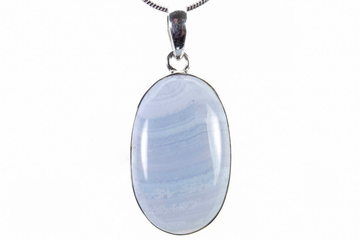 This is a wonderful, 1.2" tall (including loop) blue lace agate pendant. The agate has been shaped, polished to a glossy finish, and set in 925 sterling silver. It comes with a 24" long, silver plated snake chain necklace.