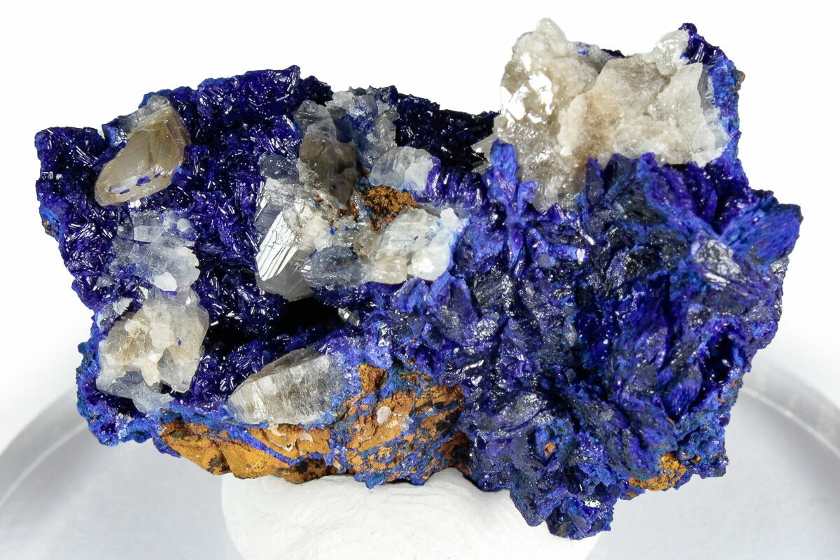 Azurite is a copper carbonate hydroxide mineral best known for its beautiful and vibrant blue appearance. Azurite typically forms in nodular formations with other colorful, copper-rich minerals. It is a secondary mineral that precipitated in pores, crevices, and caverns from water with high concentrations of carbon dioxide.