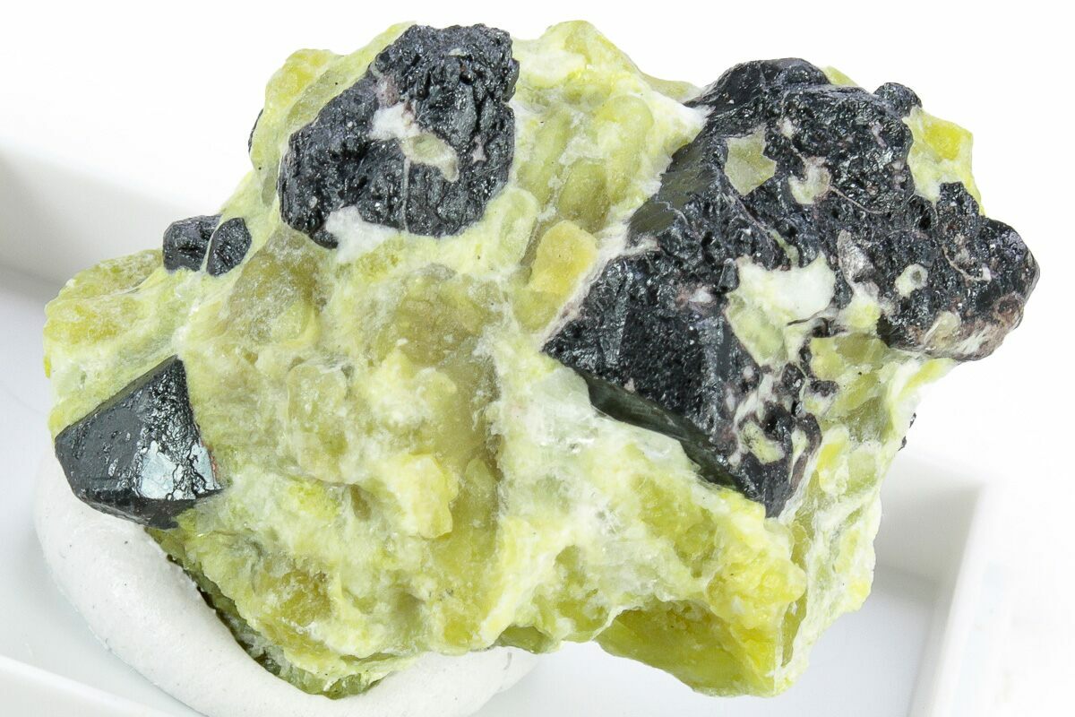 This is a 1.2" wide mineral specimen comprised of hematite crystals (pseudomorph after Ilmenite) that formed within a lizardite (yellow-green) and hydrotalcite (white) matrix. This beautiful specimen was collected from the Øvre Dypingdal Mine (Dypingdal Serpentine-magnesite deposit) of Buskerud, Norway.