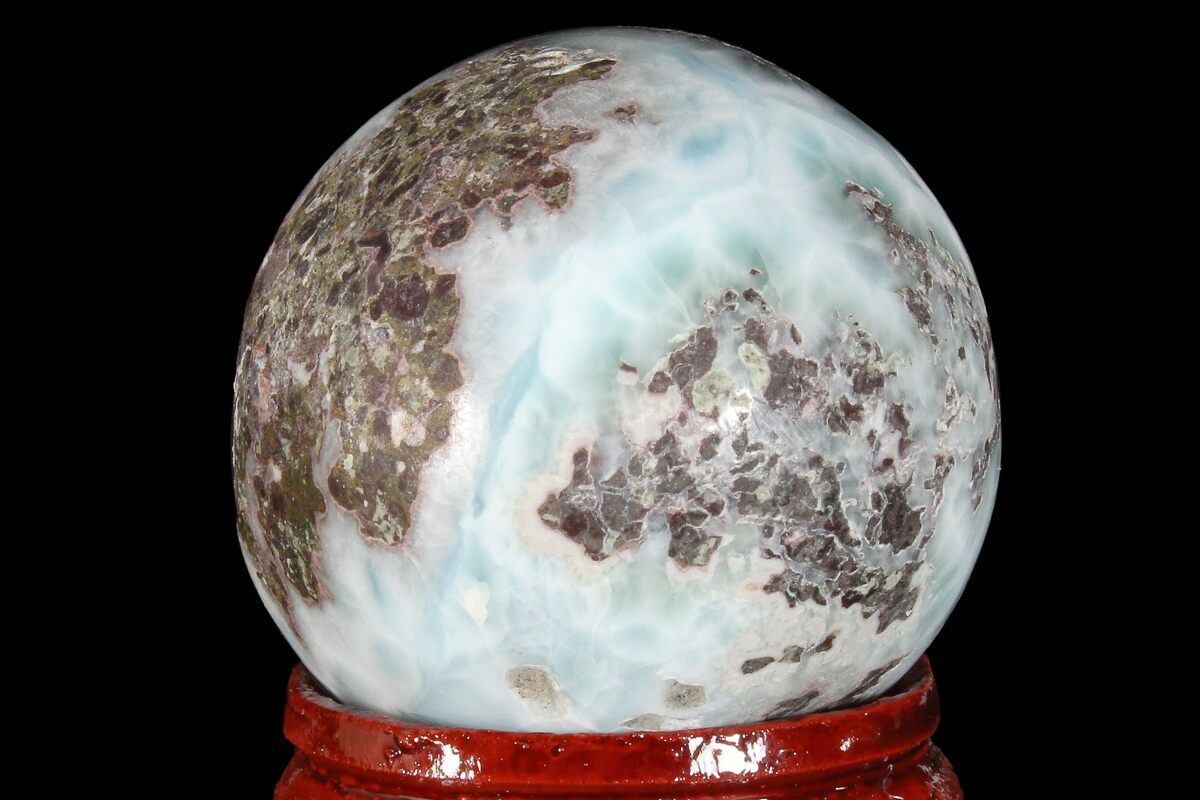 This is a stunning, 1.2" wide, hand polished sphere, made from rare Larimar from the Los Chupaderos mine in the Dominican Republic. This piece is of exceptional quality with great color and flowery patterning. Comes with the pictured display stand.