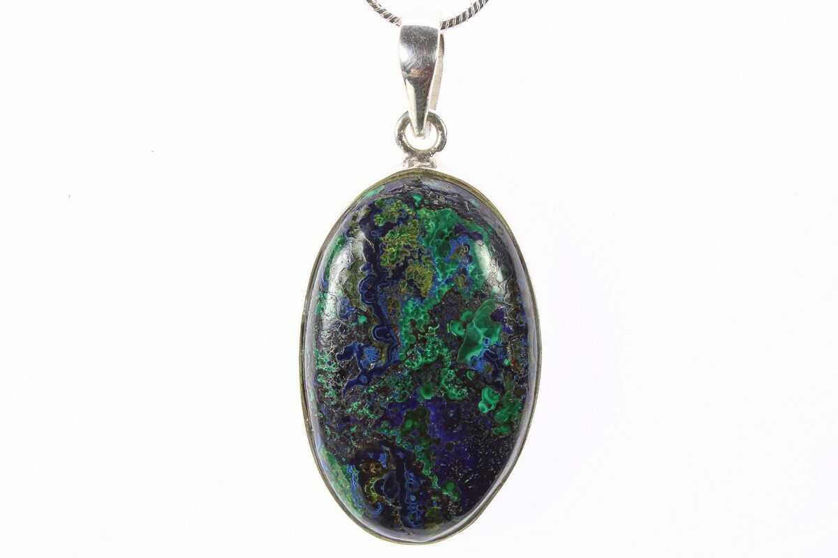 This is a beautiful malachite & azurite pendant set in 925 sterling silver. The pendant itself is 1.2" tall.