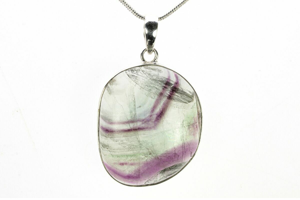 This is a beautiful, 1.25" tall (including loop) banded fluorite pendant. The fluorite was collected from China and has been polished to a glossy finish. It comes with a 24-inch silver-plated snake chain necklace.