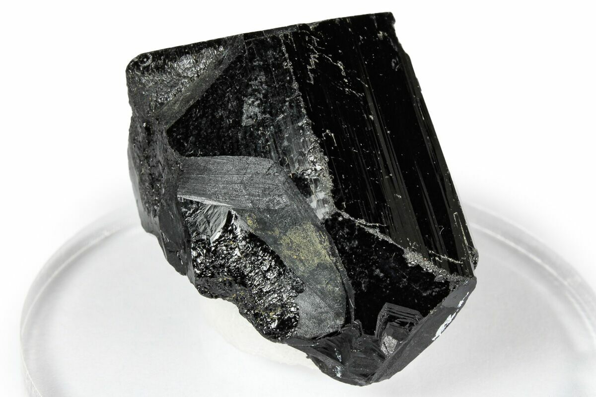 This is a lustrous black tourmaline (schorl) crystal, collected from the Erongo Mountains in Namibia. It has been mounted to an acrylic display base with mineral tack.