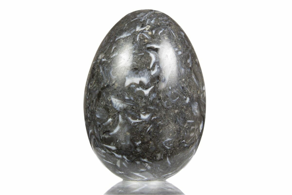 This is a beautiful piece of Coquina from California that has been polished into an egg shape. This specimen measures 1.25 inches tall and has been polished to a glossy finish to highlight the white shell fragment cross sections.