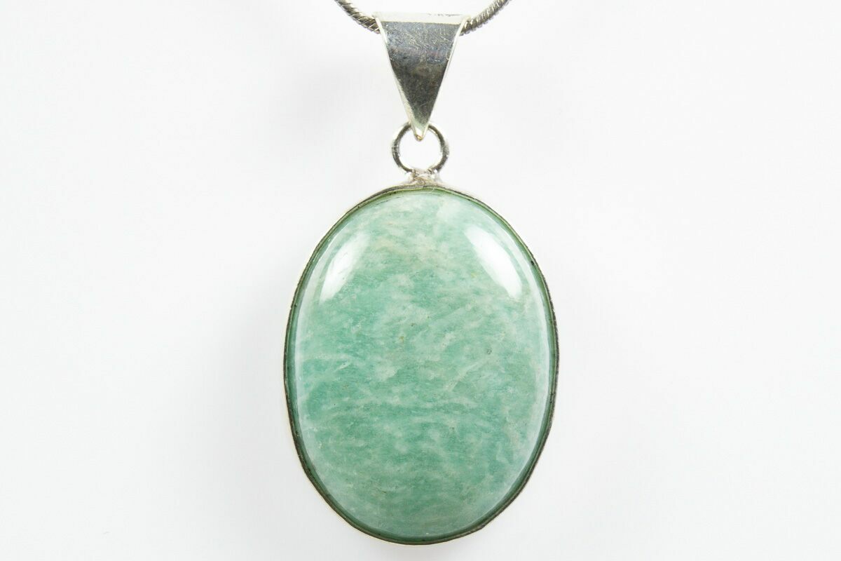 This is a alluring amazonite pendant featuring a beautiful, polished amazonite stone. The pendant itself is 1.3" tall (including loop). A 24" silver plated chain with a lobster clasp is included with the pendant. You will receive the exact pendant pictured.