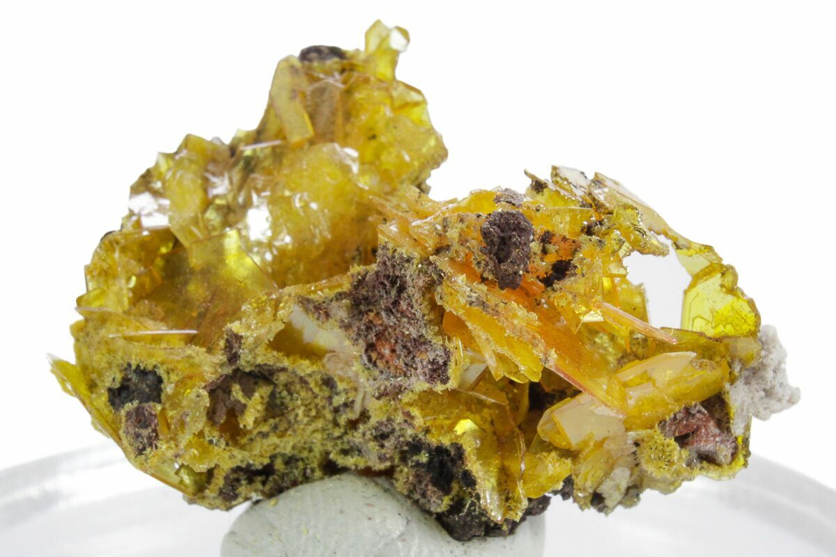 Wulfenite is a lead-based molybdate mineral with a chemical formula Pb(MoO4). It forms as a secondary mineral in the oxidation zones of hydrothermal lead deposits, its color ranging anywhere between yellow to bright orange and red and occasionally brown. Typically forming as tabular, stubby, or pyramidal crystals, this unique mineral can be both brilliantly transparent and opaque.