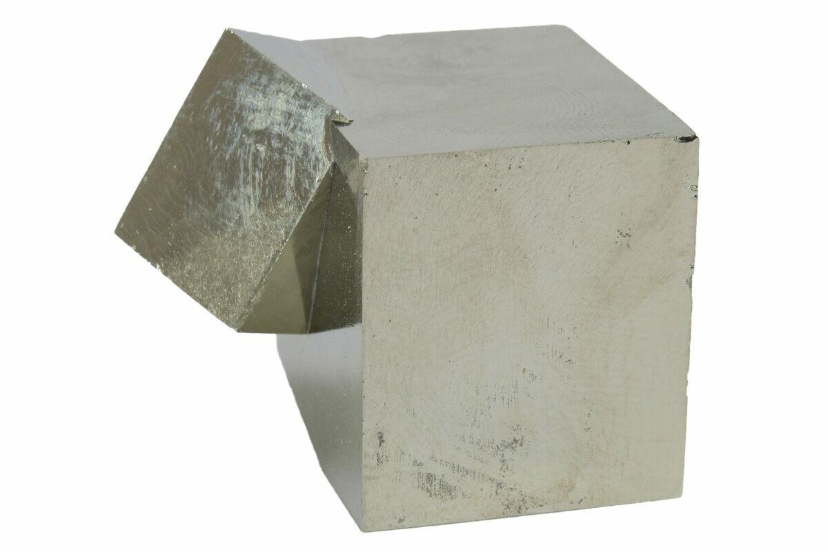 These are shiny twinned pyrite cubes from the famous Victoria Mine in Navajun, Spain. The longest measurement of this cluster is 1.3". They formed naturally and were carefully extracted from the rock where they're found using mechanical tools.