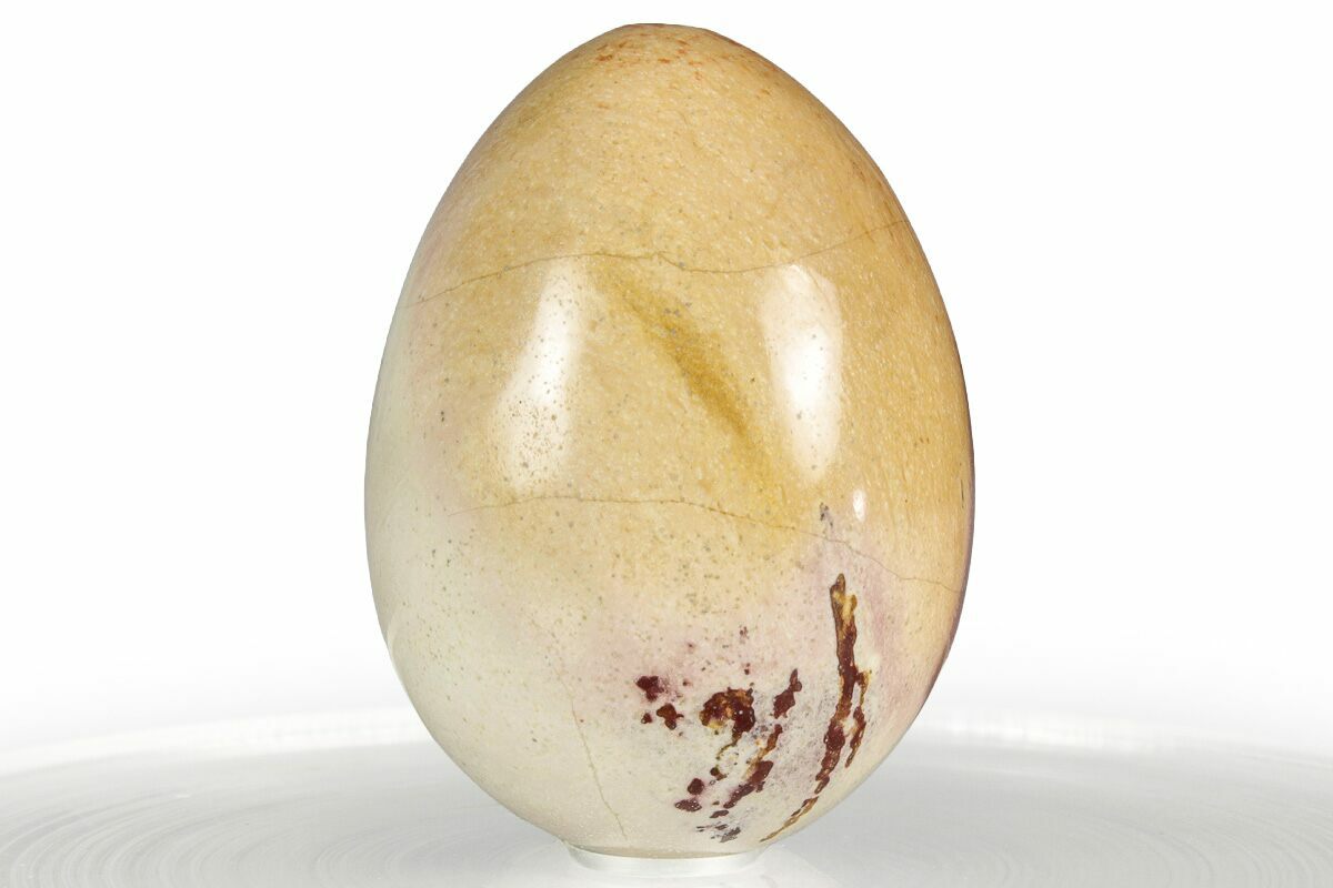 This is a 1.3" tall polished egg of binthalya opal, an opalised radiolarite (fine grained, siliceous ocean sediment). This form of common opal comes from an area in the Kennedy Ranges, located about 100 miles inland from the coastal town of Camarvon, Western Australia. It features alternating bands of pastel red, orange, purple, and tan coloration. The polish on this specimen is outstanding, with no scuffs or dull spots like those seen on lesser quality material.
