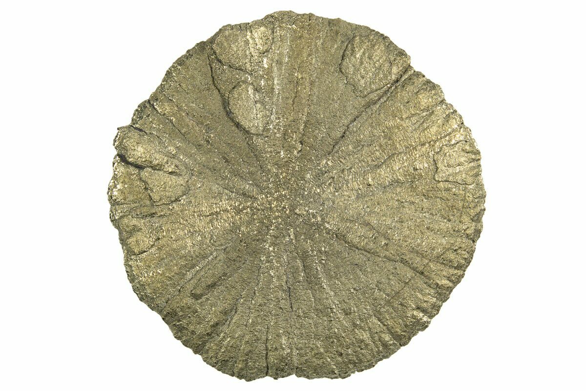 Pyrite suns or pyrite dollars are an unusual pyrite formation: striations radiate out from the center like rays of the sun. They are found in narrow, compacted seams of slate interbedded in the 300 million-year-old coal deposits near Sparta, Illinois. They are recovered as a byproduct of local coal mining operations, but are increasingly difficult to source as the coal mines in Illinois shut down one by one.