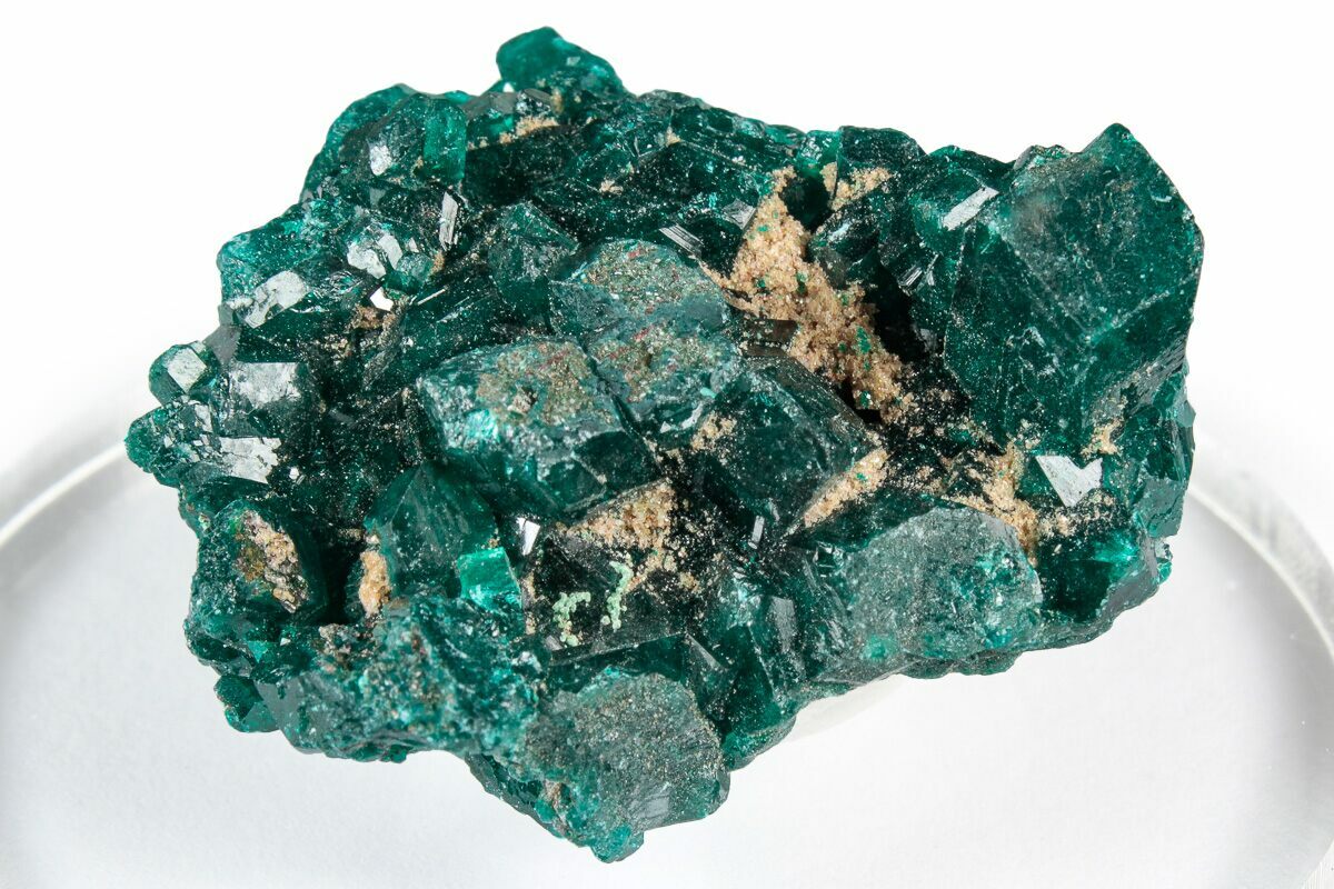 This is a sparkly 1.3" wide cluster of vibrant, emerald-green dioptase crystals mined in the Congo. The specimen features sharply terminated, glassy crystals with exceptional translucency and the intense, saturated green color that has made Congolese dioptase one of the world’s most coveted copper silicates.