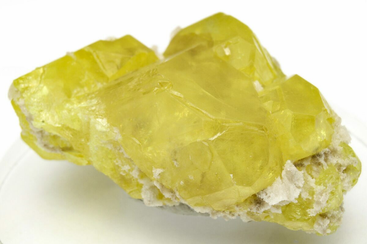 Sulfur is a striking and instantly recognizable mineral, prized by collectors for its vivid yellow coloration and its distinctive crystal habits. Chemically, sulfur occurs as S₈—ring-shaped molecules composed of eight sulfur atoms—which give rise to its characteristic resinous luster and translucent glow. In nature, well-formed sulfur crystals typically develop as sharp dipyramids or blocky, tabular shapes. These specimens most often originate in volcanic or sedimentary environments, where sulfur precipitates from sulfur-rich gases or hydrothermal fluids. Many classic localities, such as Sicily or the salt domes of Texas and Louisiana, produce crystals perched on matrixes of gypsum, aragonite, or limestone, creating visually dramatic contrasts.