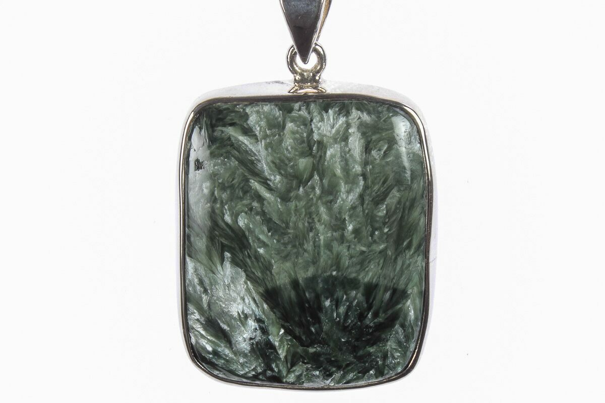 This is a gorgeous, 1.35" tall seraphinite pendant from the Korshunovskoye Iron Skarn in Eastern Siberia. This beautiful piece has been expertly shaped, polished, and set into 925 sterling silver for your enjoyment.