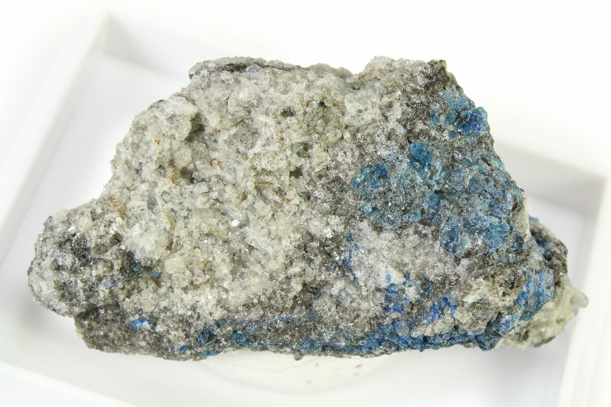 This is a 1.35" wide specimen of rare blue hauyne (haüyne) and colorless sanidine in an augite-rich matrix. It comes out of the In den Dellen quarries in the Eifel Mountains of Germany.